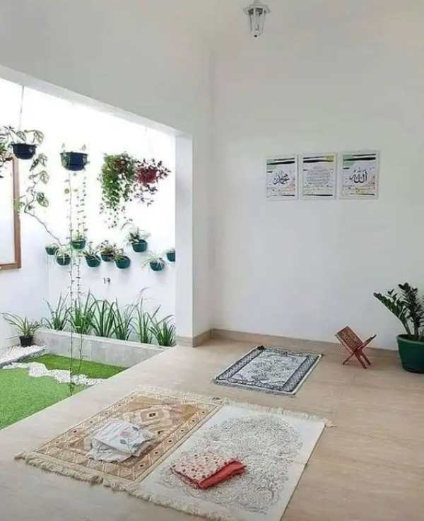 Untuk menciptakan suasana alami, letakkan mushola terbuka di dekat taman atau area hijau di rumah. Pemandangan hijau dan segar akan meningkatkan ketenangan dan kekhusyukan dalam beribadah. - Batas Ruang dengan Tanaman